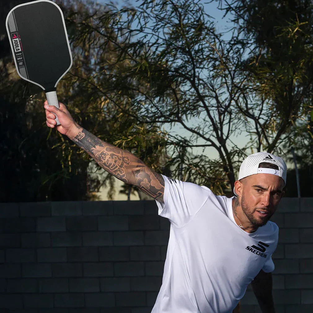 The Joola Tyson McGuffin Magnus Pro IV Duel 14mm Pickleball Paddle has an elongated head shape to maximize hitting power. Tech Flex technology combines materials, construction, and design to optimize weight distribution that enhances the paddle's flexibility, power, and sweet spot without sacrificing structure. A specialized foam-injected edge further aids the structure while also improving the sweet spot. Propulsion Core technology gives your shots explosive power while the cutting-edge textured carbon fiber surface maximizes spin. Use the Joola Connect app to tap your phone on the paddle's NFC-enabled handle for an exclusive product experience!