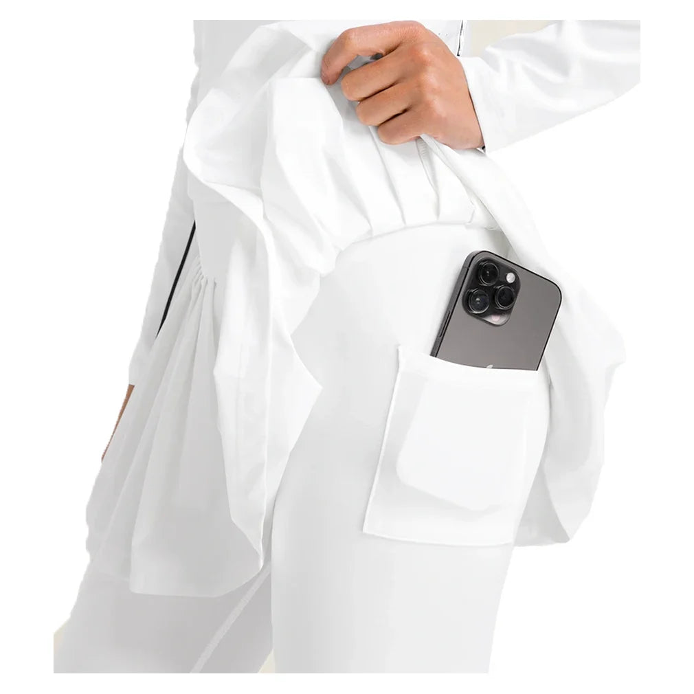 The Wilson Women`s Midtown Skirty Tennis Tight Bright White is a full-length take on the classic pleated tennis skirt, designed to keep you comfortable and performance-ready in cooler temperatures. Featuring a multi-modulus waistband, it provides graduated support and a secure fit without restricting movement. The ultra-lightweight knit fabric ensures breathability and ease of motion, while seamless technology minimizes waste and enhances comfort. Quick-drying properties keep you feeling fresh, and the media pocket on the left leg offers convenient storage for small essentials. With a 7/8 length that hits just above the ankle, this sleek and functional piece is the perfect blend of fashion and performance for the changing seasons.